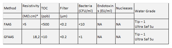 AAS tekniklerinin yüksek hassasiyeti, boşlukları, standartları ve numuneleri hazırlamak için kullanılan suyun, sonuçların doğruluğunu ve güvenilirliğini etkileyebilecek kirleticiler içermemesinin önemli olduğu anlamına gelir. Bu, özellikle alt ppb seviyelerinde tespit limitleri olan GFAAS için geçerlidir ve analitik iş akışı sırasında kullanılan tüm suyun sonuçlara müdahale edebilecek herhangi bir element veya bileşikten arınmış olmasını zorunlu kılar. |
